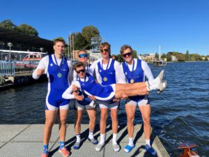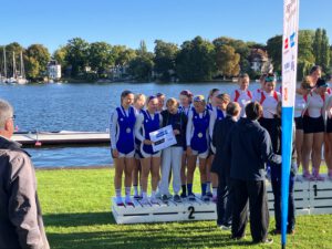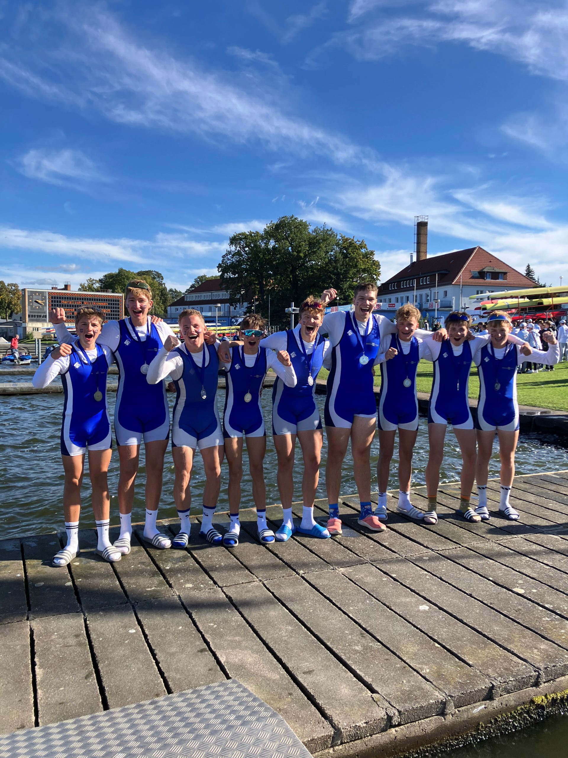 Im Rahmen des Bundesfinales findet aber seit Jahren ebenfalls der Schüler*innen-Achter-Cup der Deutschen Ruderjugend sowie seit diesem Jahr auch der Schüler*innen-Cup (in Vierer-Mannschaften) statt. Hier waren bei den Juniorinnen unsere bereits erwähnte Lea Scherenberg gemeinsam mit Merle Schleef und ihrer Mannschaft erfolgreich. Nach dem Sieg im Vorjahr, konnten sie in diesem Jahr auf einen starken Silberrrang rudern. Die Sportschule Potsdam gewann in diesem Rennen, das Bessel-Gymnasium Minden kam auf Platz drei ins Ziel.