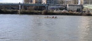 Am Regattatag gab es viel Sonne, aber auch eiskalten Wind. Défi-Seine im Winter – etwas ungewohnt, denn sonst war die Regatta immer im Herbst. Viel Regen stromaufwärts um Paris und dort geöffnete Rückhalte-Speicher sorgten für viel Wasser und Wellen in der Seine. Aber zehn Motorboote an den wichtigen Punkten der Strecke sowie Seenotrettung mit Tauchern sorgten für die Sicherheit. Und als kurz vor dem Start mit Hilfe eines fluchenden Franzosen noch eine Schraube am Boot gewechselt werden konnte, ging es los. Ein Rundkurs: An der einen Seite der Seine-Insel hoch, dann an der anderen runter. Vier Kilometer mit und zwei gegen die Strömung – nach einer Wende um eine Boje. Die Boote starteten im Minutentakt.